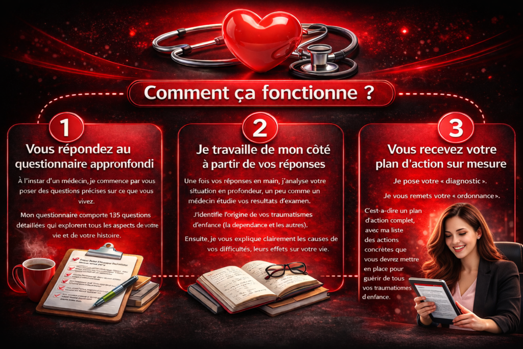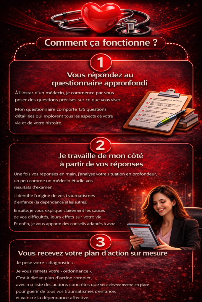 - ✓ Diagnostic clair de la dépendance affective ET de vos autres traumatismes.