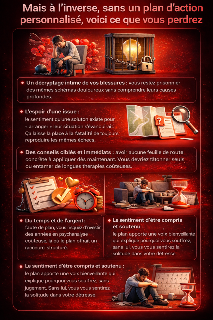 Des conseils ciblés et immédiats : avoir aucune feuille de route concrète à appliquer dès maintenant. Vous devriez tâtonner seuls ou entamer de longues thérapies couteuses.