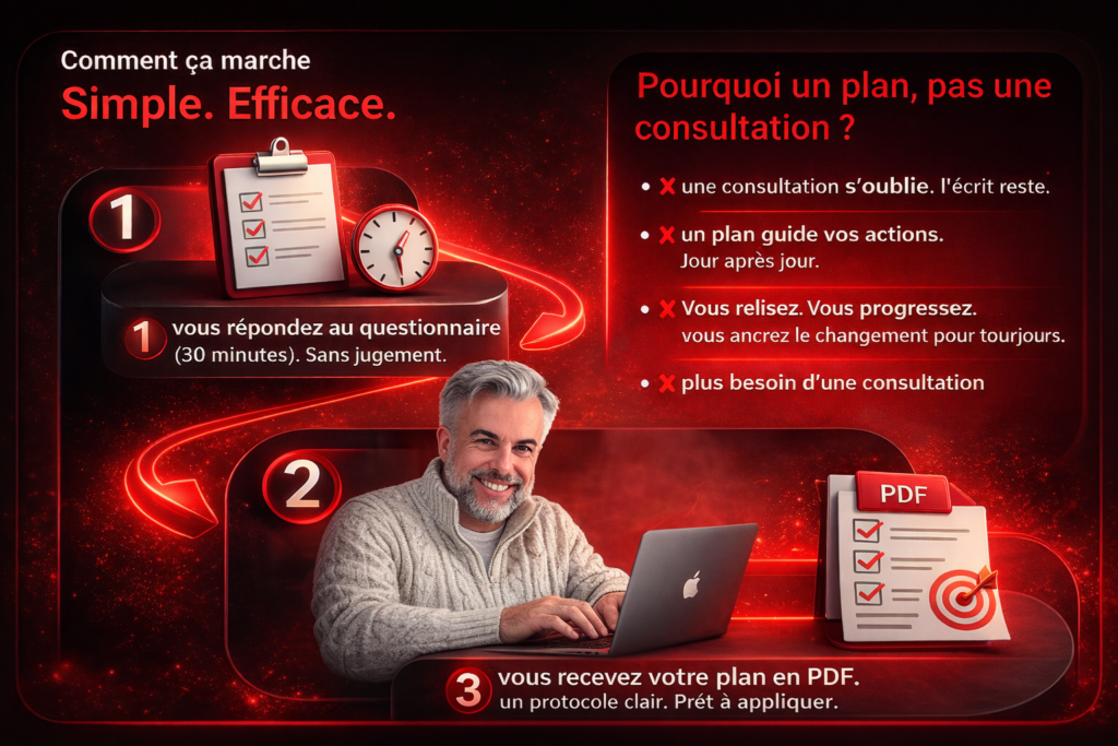 - Vous recevez votre plan en PDF. Un protocole clair. Prêt à appliquer.