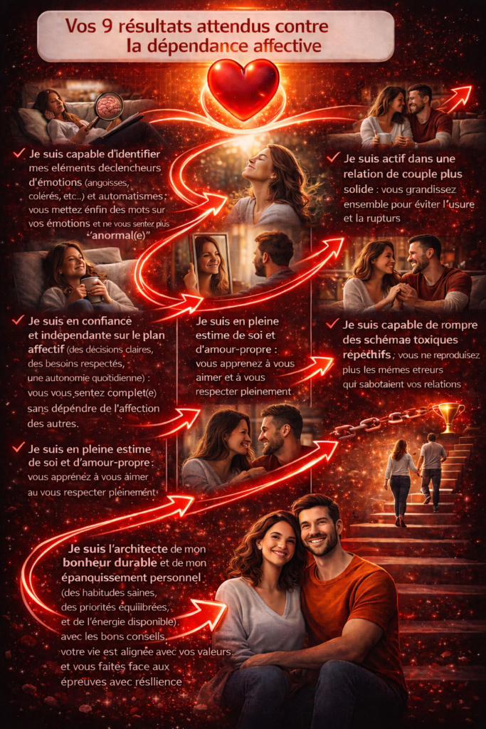 - ✓ Conseils adaptés à votre situation : des recommandations spécifiques à votre histoire et à votre situation sentimentale. Vous saurez exactement quoi changer et comment agir dans votre vie quotidienne pour sortir de la dépendance affective.